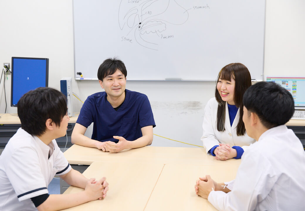 長崎大学消化器内科では専攻医教育に力をいれています。肝胆膵班・消化管班・化学療法班の3つの班をローテーションし、消化器内科医としての基礎を学んでいただきます。2018年よりチーム制での診療を導入しており、教員をチーム長とした複数名診療を行っています。