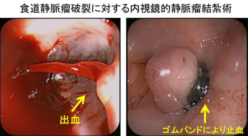 肝硬変へと進行すると、肝臓の機能低下や肝臓へ血流障害により様々な合併症が出現します。腹水・肝性脳症・食道胃静脈瘤が代表的な合併症であり、特に静脈瘤からは出血をきたし緊急対応が必要なことがあります。当科では食道・胃静脈瘤に対する内視鏡治療を行っています。