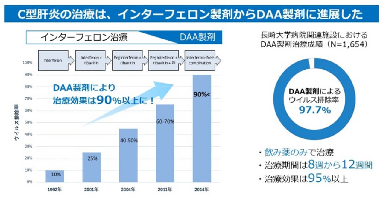 B型・C型肝炎ウイルスに関しては治療薬の発展により制御可能となり、ウイルス性肝炎が原因の肝硬変や肝癌は減少傾向にあります。しかしながら検査の機会がなく、B型肝炎、C型肝炎の感染に気づいていない患者さん、もしくは気づいていても治療を受けていない患者さんも依然として多いことも報告されています。当院ではウイルス性肝炎患者さんの治療やフォローアップを積極的に行っております。お気軽にご相談ください。